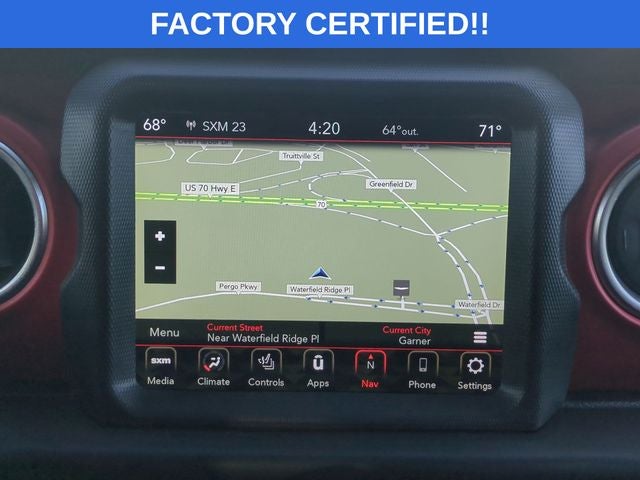 The Gladiator's standout features include a body-color 3-piece hard top, LED lighting group, cold weather group, safety group, remote start system, and a trailer tow package. Inside, you'll find premium leather-trimmed bucket seats, an 8.4-inch Uconnect infotainment system with navigation, a premium audio system, and a host of advanced safety technologies like blind spot monitoring and rear park assist.