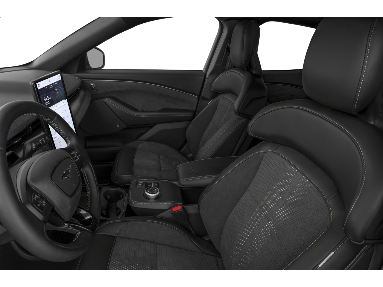 The interior of the Mustang Mach-E GT is equally impressive, boasting a panoramic fixed-glass roof that floods the cabin with natural light, creating a spacious and airy atmosphere. The heated ActiveX Sport Seats and heated steering wheel ensure your comfort, while the SYNC 4A with Enhanced Voice Recognition and Connected Navigation keep you connected and in control.